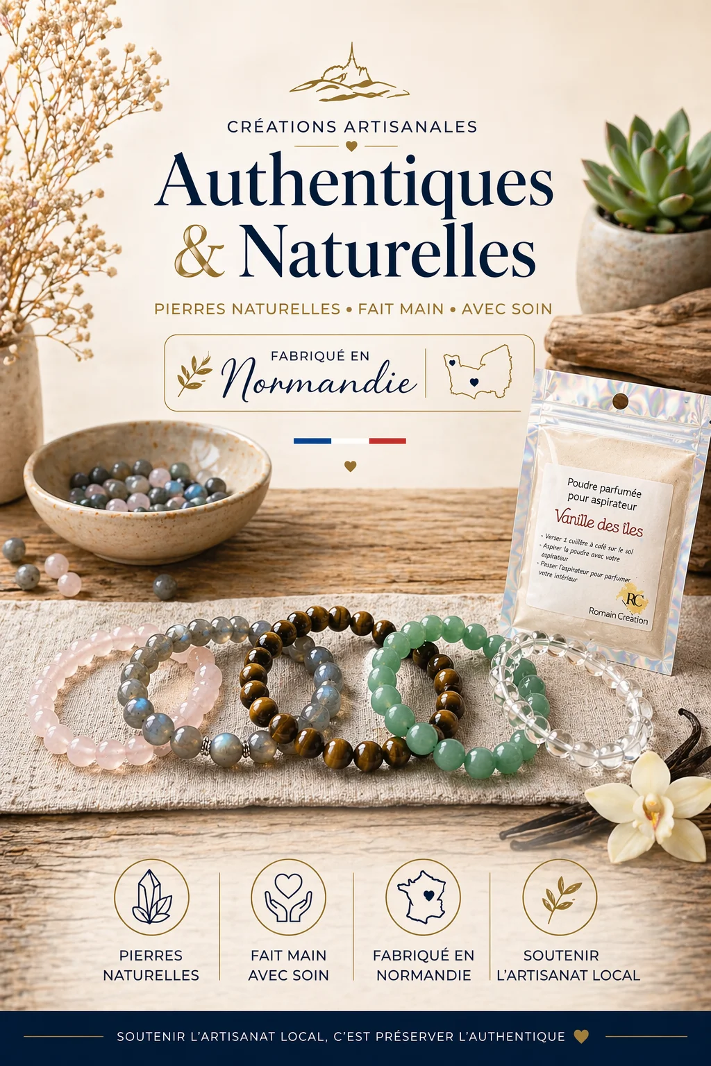 Nos bracelets en pierres naturelles, fabriqués artisanalement en Normandie, sont conçus pour vous accompagner au quotidien. Chaque création est réalisée à la main afin de préserver l’énergie authentique des minéraux tout en offrant un bijou élégant et intemporel.