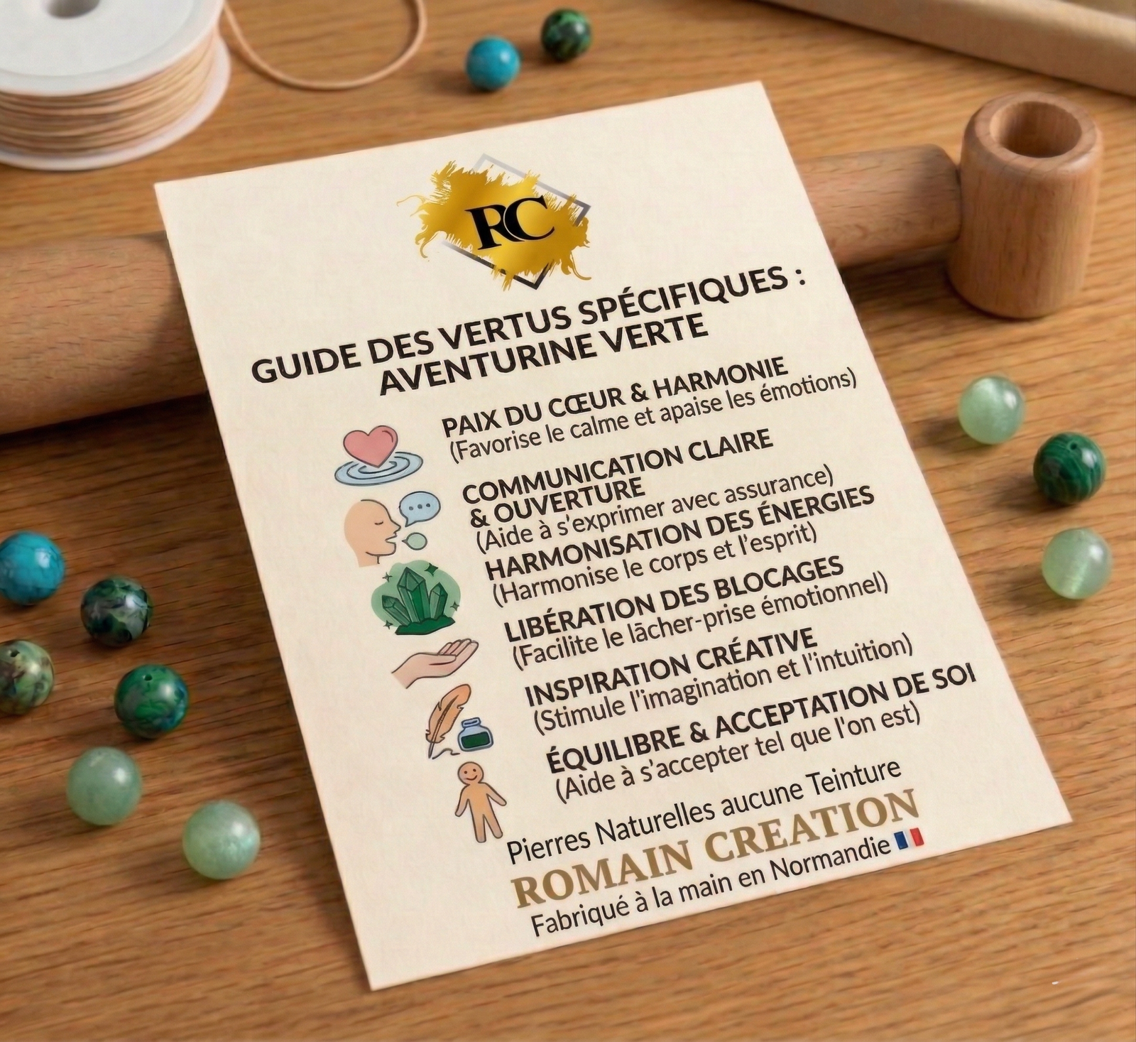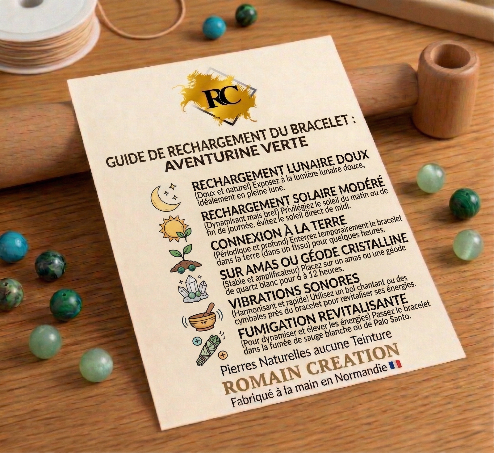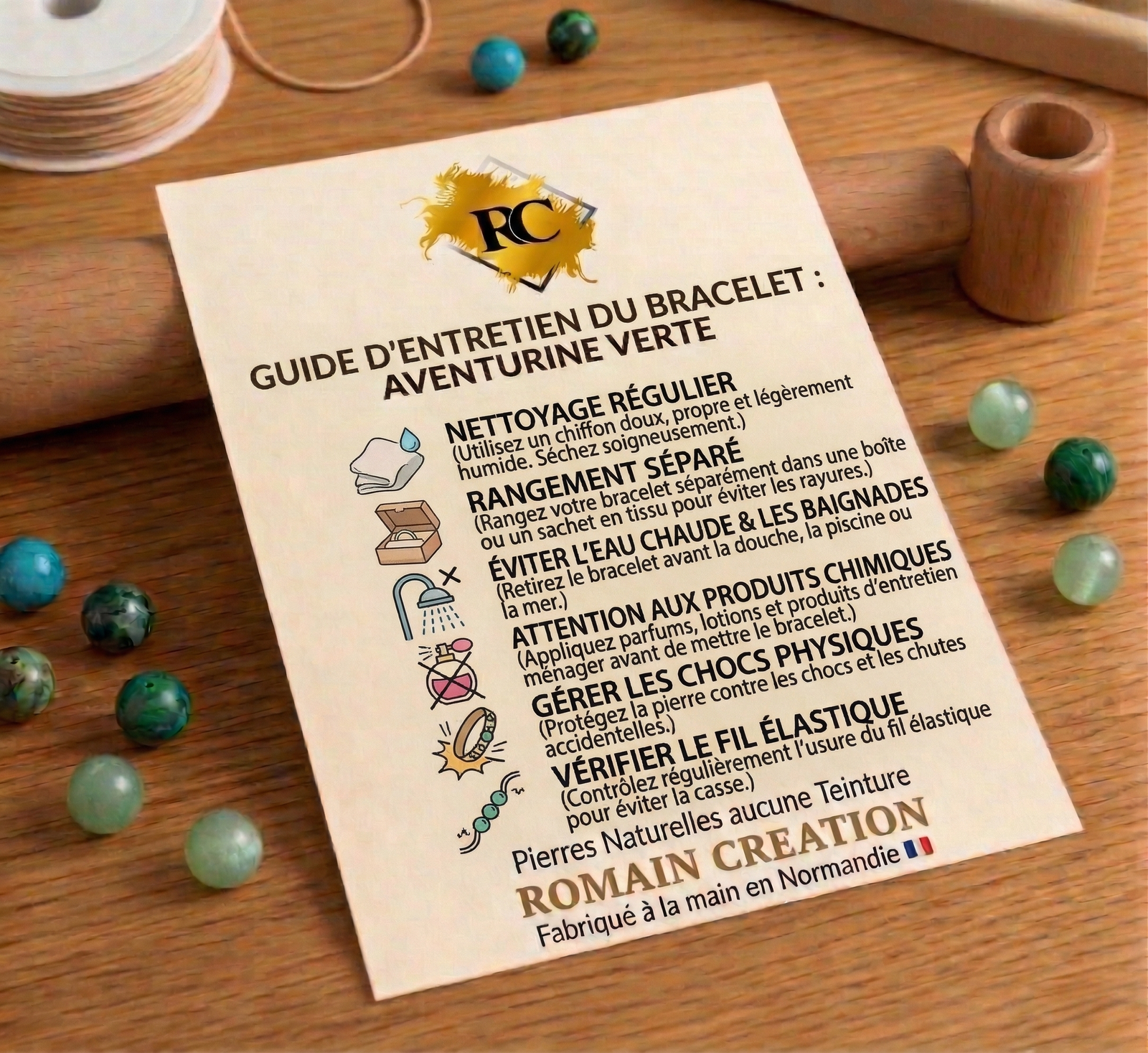 Ce bracelet en Aventurine est une véritable création artisanale. Il est fabriqué à la main, en France, par Romain, l’artisan fondateur de la marque Romain Creation, dans son atelier situé en Normandie.