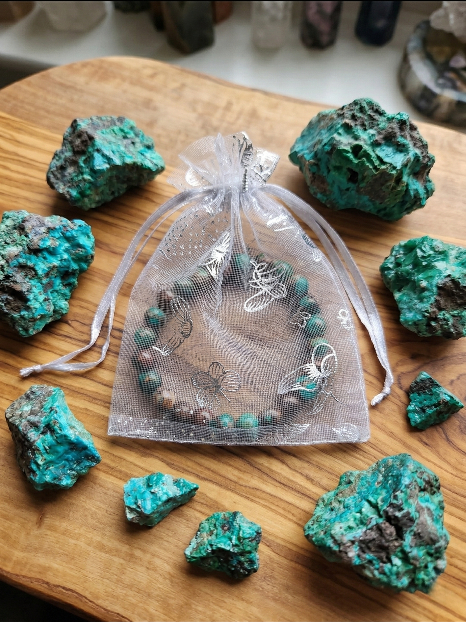 En lithothérapie, la Chrysocolle est une pierre de paix, d’apaisement et de communication. Elle calme les émotions tumultueuses, favorise l’expression sincère (Chakra de la Gorge) et aide à retrouver une harmonie intérieure. (Rappel : ne remplace pas un avis médical).