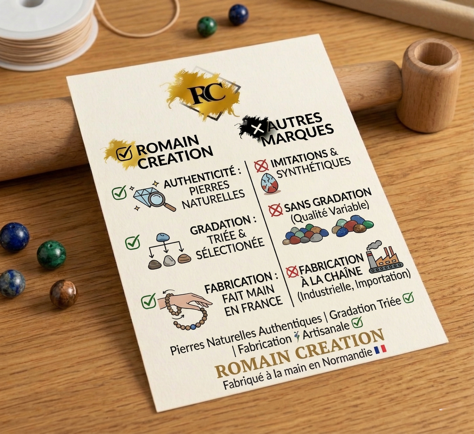Il s’agit d’une véritable création artisanale française. Ce bracelet est conçu, purifié et assemblé à la main, perle par perle, par Romain, créateur de la marque Romain Creation, directement dans son atelier en Normandie.