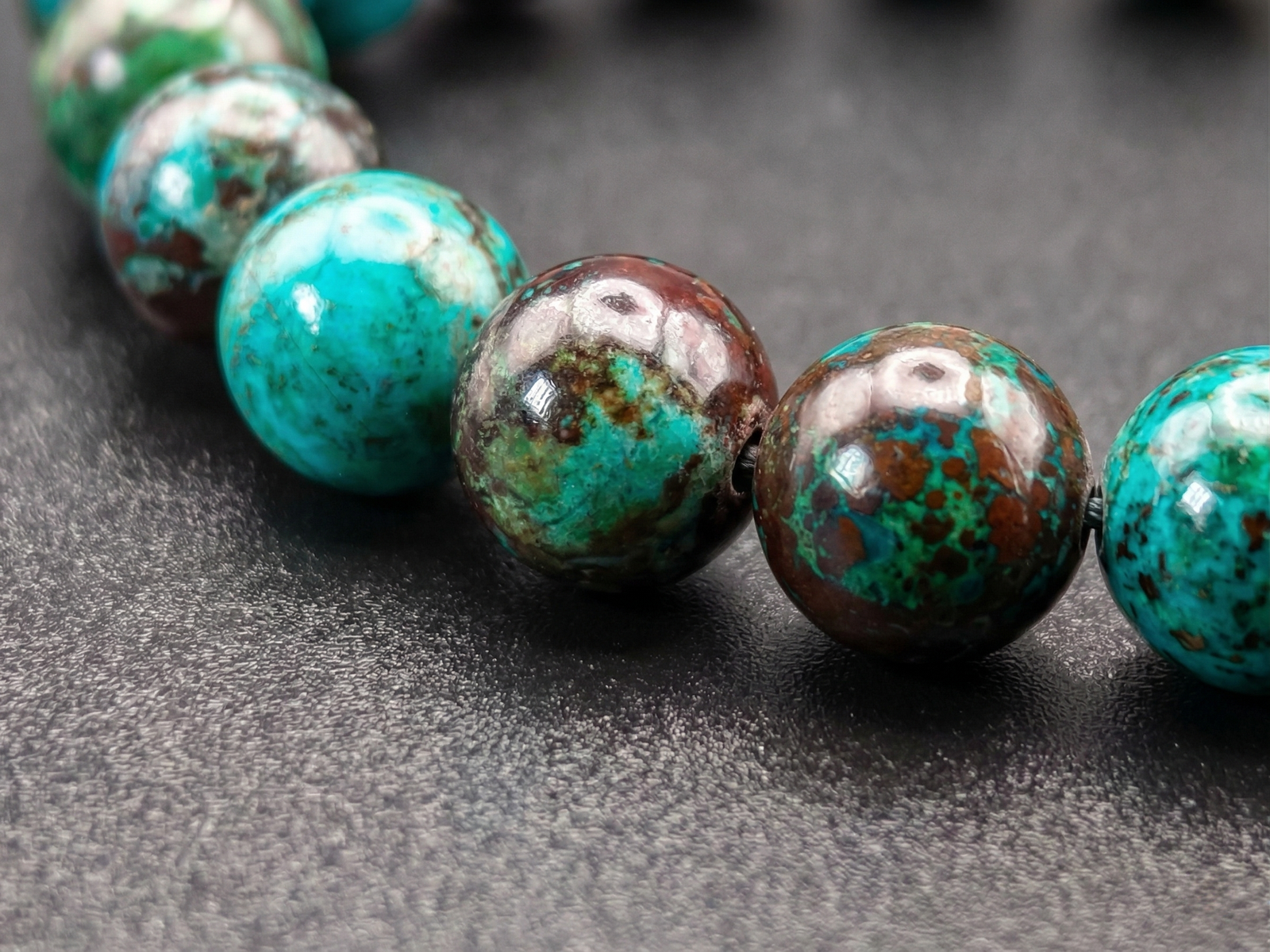 Porter un bracelet en Chrysocolle, c’est comme porter un fragment de notre planète au poignet. Cette pierre précieuse en lithothérapie se distingue par ses incroyables volutes de couleurs, mêlant le bleu turquoise des océans au vert profond des forêts. Pour cette création haut de gamme, j’ai sélectionné de superbes perles de 8 mm en Grade AA. Cette qualité supérieure vous garantit des couleurs intenses, vibrantes, et un polissage d’une douceur remarquable. C’est un bijou d’un raffinement absolu, conçu pour les amoureux des pierres d’exception.