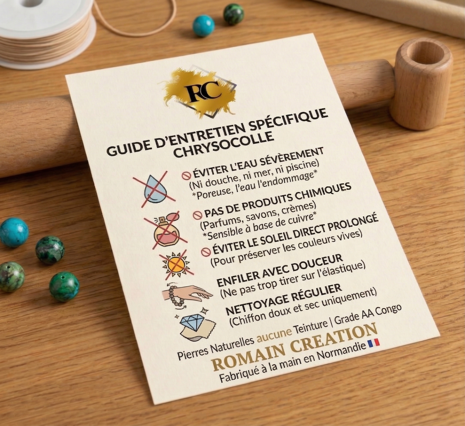 Ce bracelet n’est pas issu d’une production industrielle. C’est une pièce d’artisanat d’art, fabriquée personnellement et à la main dans mon atelier en Normandie. Chaque perle de Chrysocolle est choisie et positionnée minutieusement pour créer une harmonie visuelle parfaite, puis montée sur un fil élastique professionnel pour assurer une longévité digne de son positionnement haut de gamme.