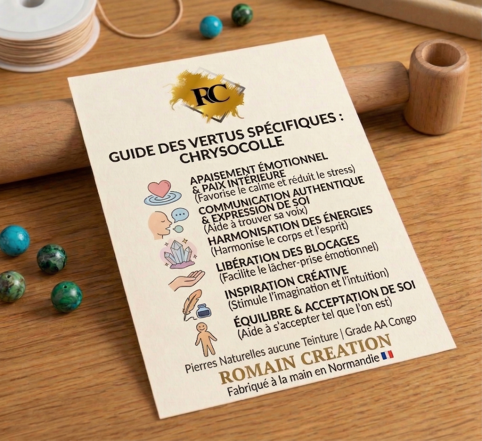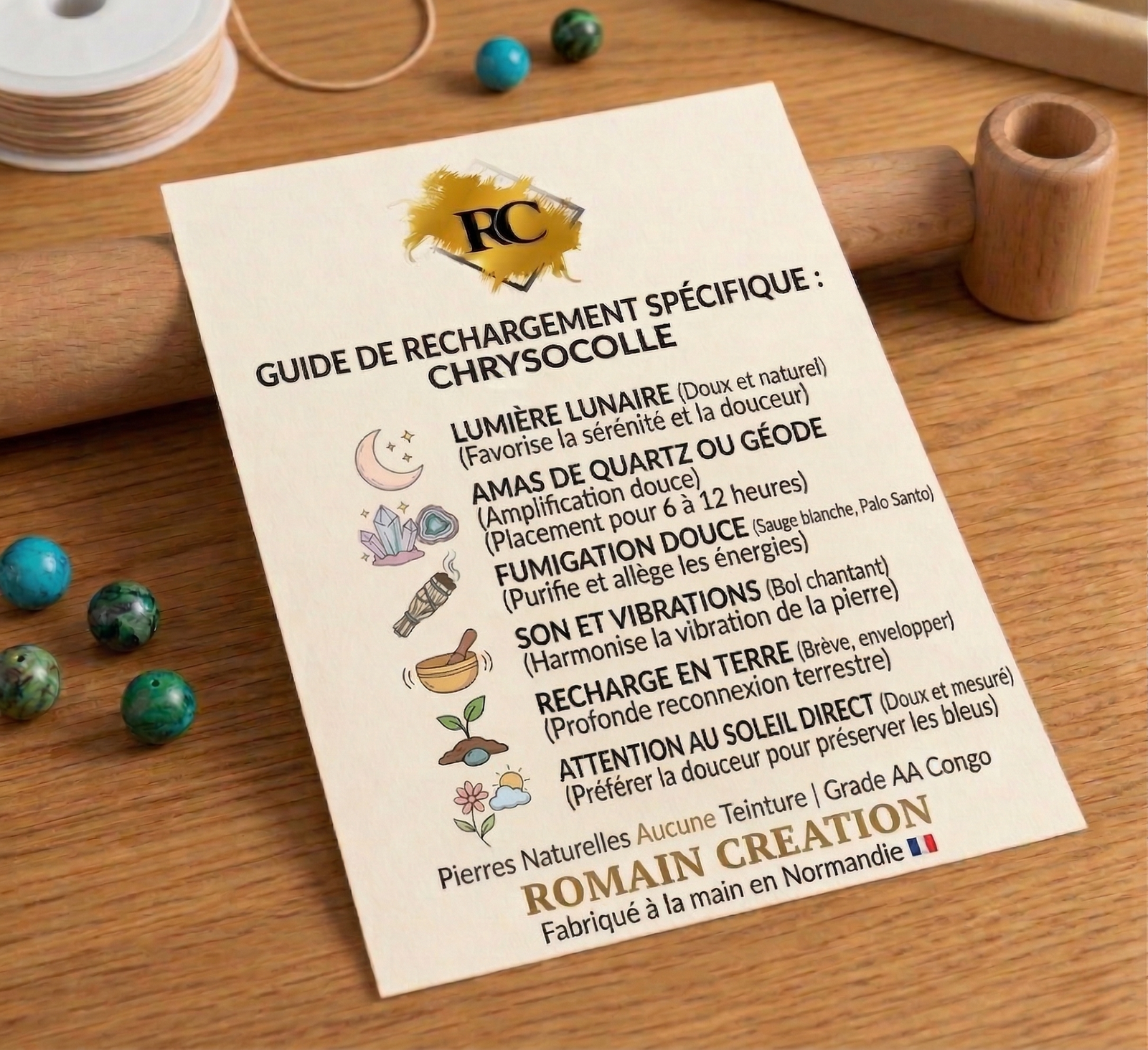 📖 Pour aller plus loin : La Chrysocolle est une pierre délicate qui nécessite un entretien doux pour préserver ses couleurs. Retrouvez mes conseils de purification, de rechargement et ses associations idéales dans mon Guide complet de la lithothérapie : la Chrysocolle.