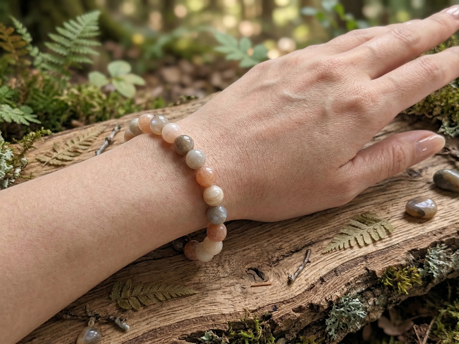 Laissez vous captiver par la lueur mystérieuse de la Pierre de Lune. Ce bracelet est minutieusement assemblé avec des perles naturelles de 8 mm, sélectionnées en Grade A+. Cette exigence de qualité vous assure des pierres lumineuses, d’une belle clarté laiteuse, révélant de subtils reflets bleutés ou blancs (appelés adularescence) à la lumière. Un bijou d’une grande poésie, idéal pour vous accompagner au quotidien.