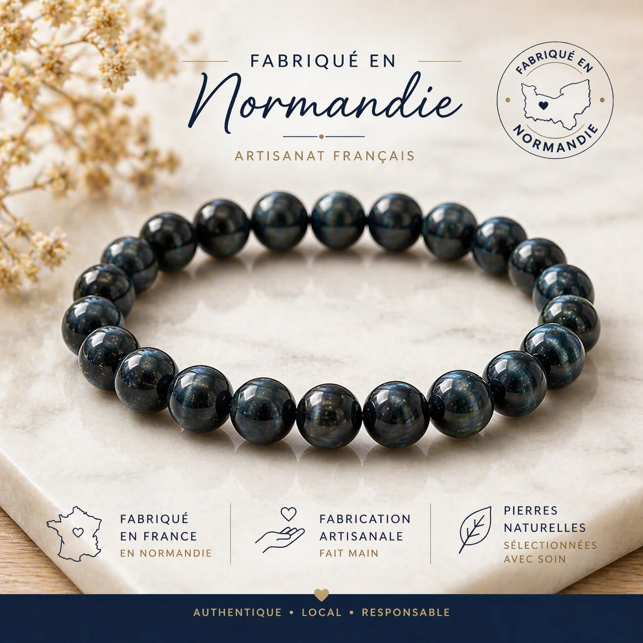 Chaque bracelet est fabriqué à la main en Normandie avec une attention particulière portée à la qualité et aux détails. Une création authentique qui valorise le savoir-faire local.